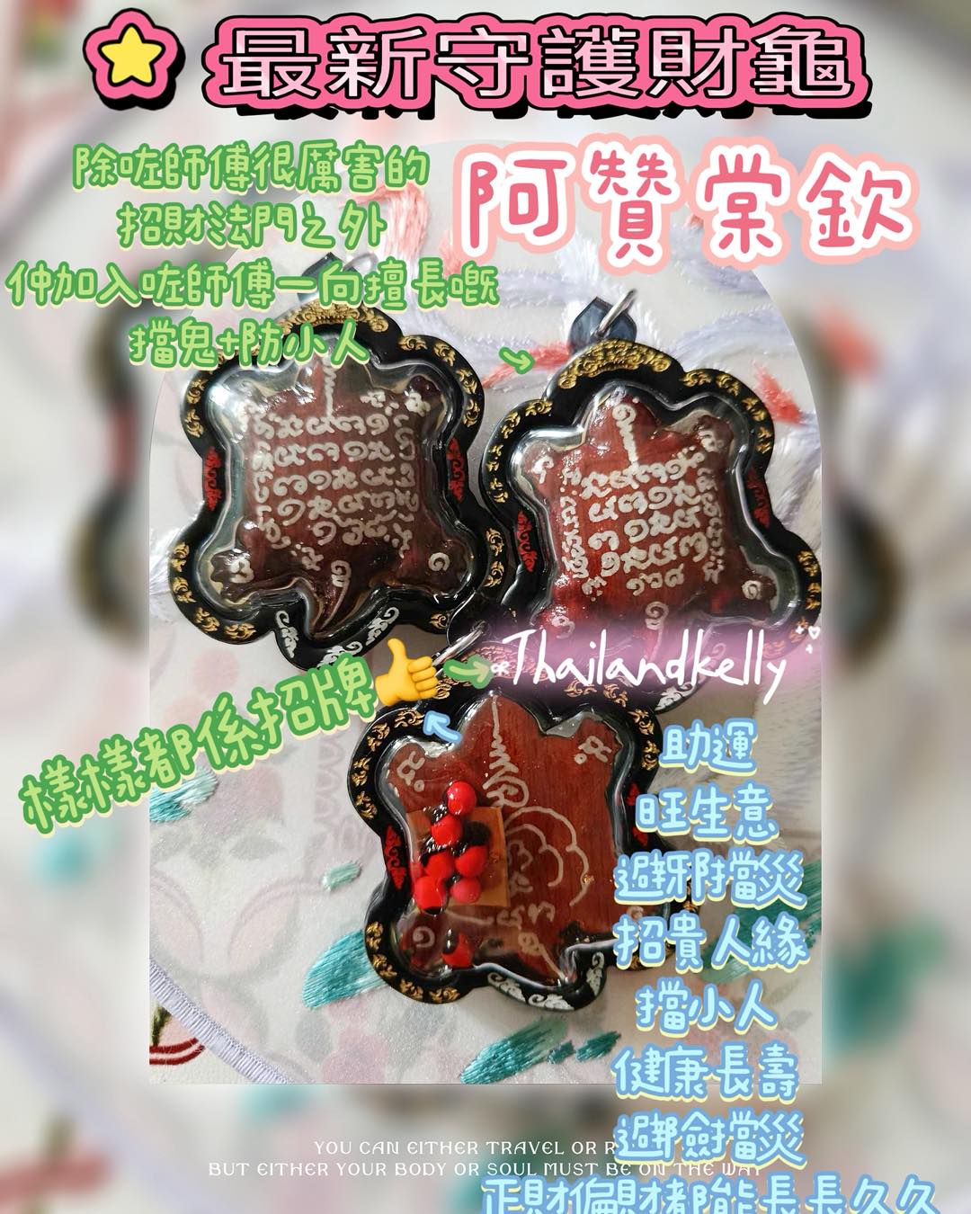 阿贊棠欽 守護財龜 ✨ 功效特色: 烏龜法門🐢就是正財偏財都能長長久久! 同時可以助運,旺生意,避邪擋災,讓你充滿正能量,招貴人緣、招財龜可助生意事業順利財運旺盛旺好運,招正財偏財,事業順利成功、保平安、擋小人、健康長壽、避險擋災,助生意,人緣,讓你聚財守財招財,財源滾滾來,可抵擋各種倒霉險災人禍 另外師傅獨當一面的擋鬼擋降 同埋防小人法門,不容忽視喔! ✨ 功效特色: 🩸 擋災避險 × 鎮煞封印 🩸 🔒 擋煞避險:轉移災劫、厄運不沾身 👻 擋鬼避邪:陰煞不近身,夜夜好眠 ✨ 功效特色: 👍轉運護主 👍人事糾紛 👍霉運纏身之時咬噬小人 👍擊退小人