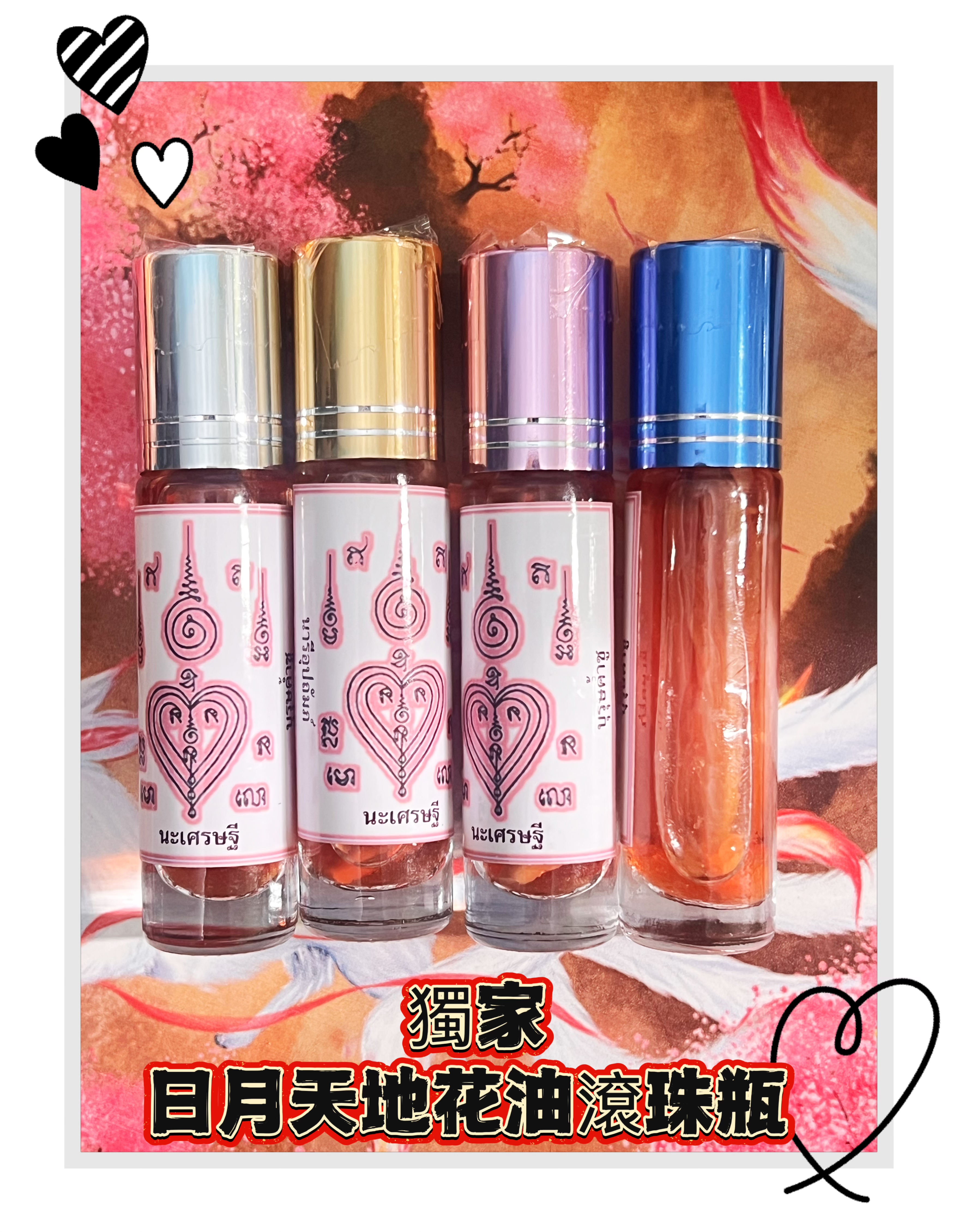 日月天地花油滾珠瓶 🌙🌞🌸✨ 師傅親手栽種・ 花朵吸收日月精華・心願順遂 🌸✨ 《日月天地花油滾珠瓶》 是阿贊漂師傅一年中極少製作、極為珍稀的心意之作。瓶內所用花朵,皆由師傅親手栽種、親自呵護,汲取天地靈氣、日月光華滋養,最後小心填入每一瓶滾珠中,只為將這份自然能量與祝福傳送給你。 🌙🌞 每一滴花油都像是集結了白晝陽光的溫暖與夜晚月光的寧靜,為你調和內心磁場,穩定情緒,帶來順遂與圓滿的心想事成能量。 🌟 使用功效 ✅ 日月花力護佑,心願更容易實現 ✅ 調和心緒,增強吸引好事的頻率 ✅ 天地滋養的能量幫你轉好運、去晦氣 ✅ 讓每日人緣、財氣、機會跟著提升 📌 使用方式 輕輕滾抹於手腕、耳後、胸口或眉心,深呼吸三次,心中默許願望。日常可隨時使用,增強自我好運感與磁場吸引力。 🌸🌙✨ 日月天地花油 — 將師傅親栽花朵的天地靈氣留在你身邊,日日如願,事事順心! 💫🌼